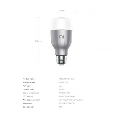 The Mi Smart Bulb 950 offers a Luminous Flux of 950 lumens, a color temperature range of 1700–6500 K, and a rated power of 9 W. It uses an E27 lamp fitting and has Wi-Fi connectivity (IEEE 802.11 b/g/n 2.4 GHz). The bulb also has a service life of approximately 25,000 hours.